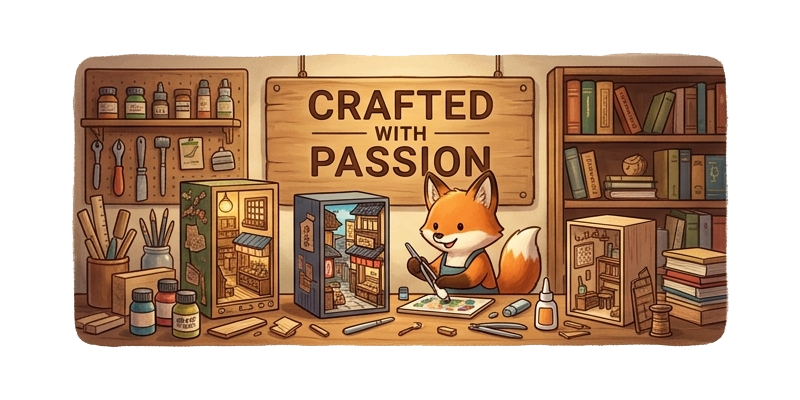 We are Book Nook hobbyists just like you. We know that quiet, late-night joy as a miniature world comes to life under your fingertips. Because we share your pursuit of perfection, we don’t just stock shelves; we curate with a maker’s heart - selecting only the kits that meet our high standards for detail, quality, and wonder.